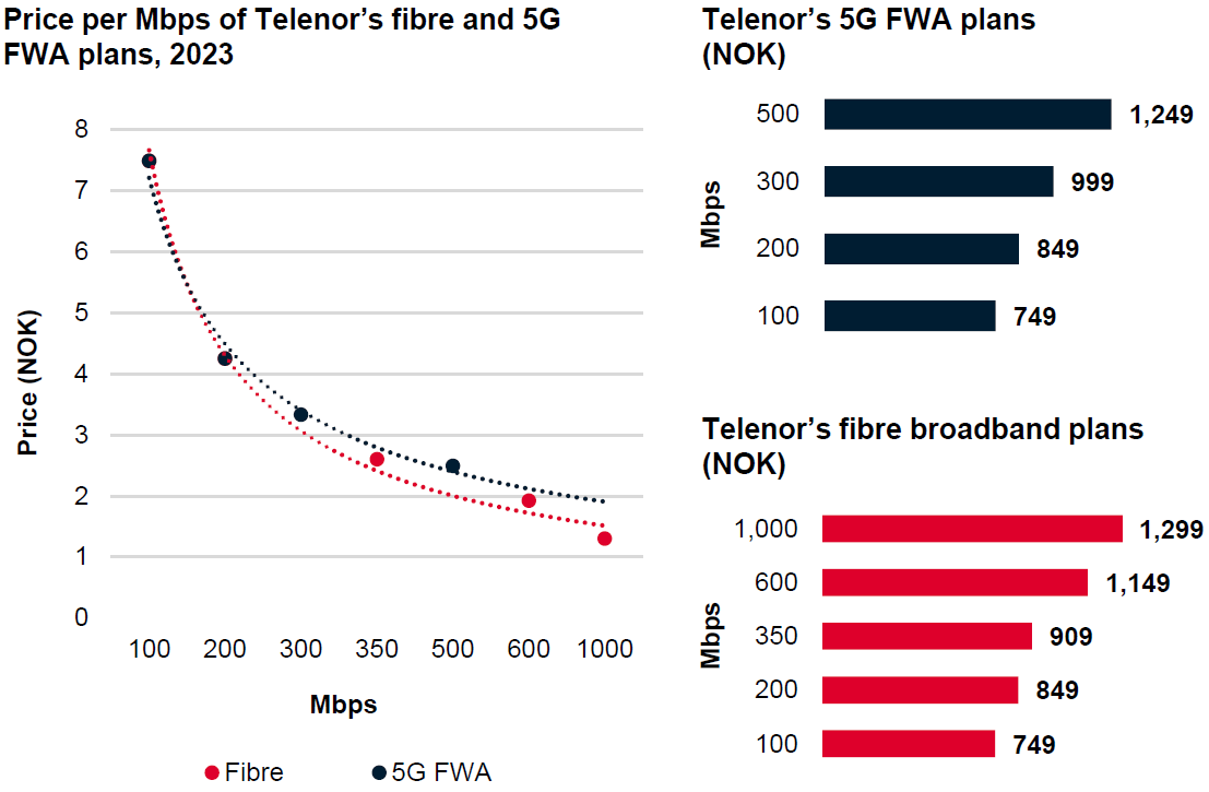 Telenor 1,000 Mbps 光纤宽带(1,299 挪威克朗/月)只比 500 Mbps 的 5G FWA (1,249 挪威克朗/月)价格高 4%。