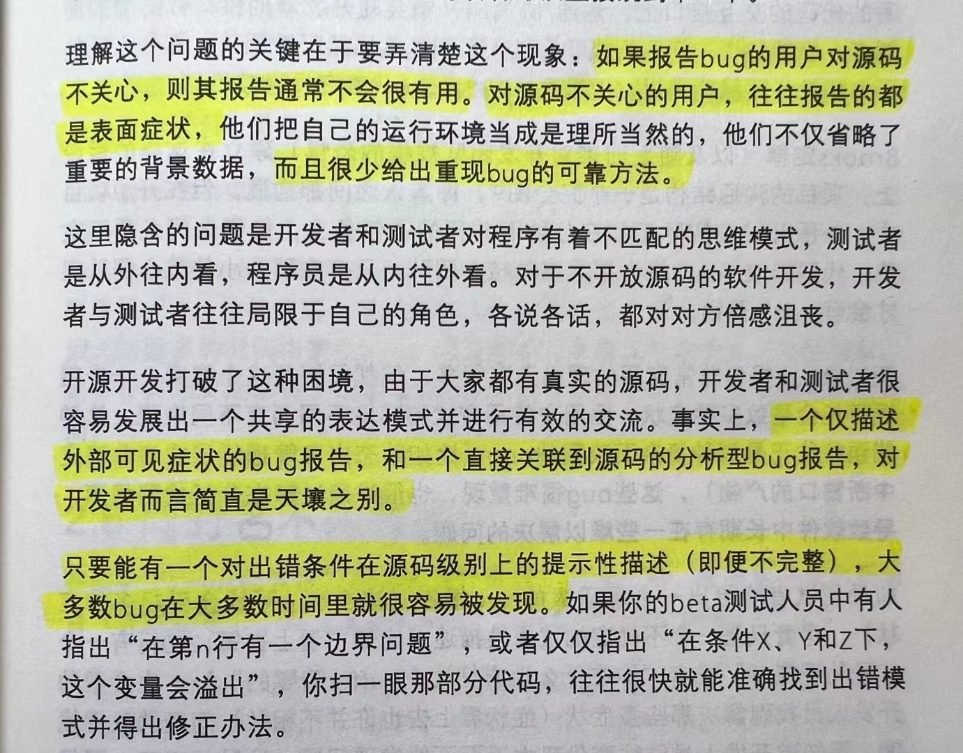 ② 高品质的 bug 反馈,要求报告者对源代码有了解:一个仅描述外部可见症状的 bug 报告,和一个直接关联到源码的分析型 bug 报告,两者的价值是天壤之别。
