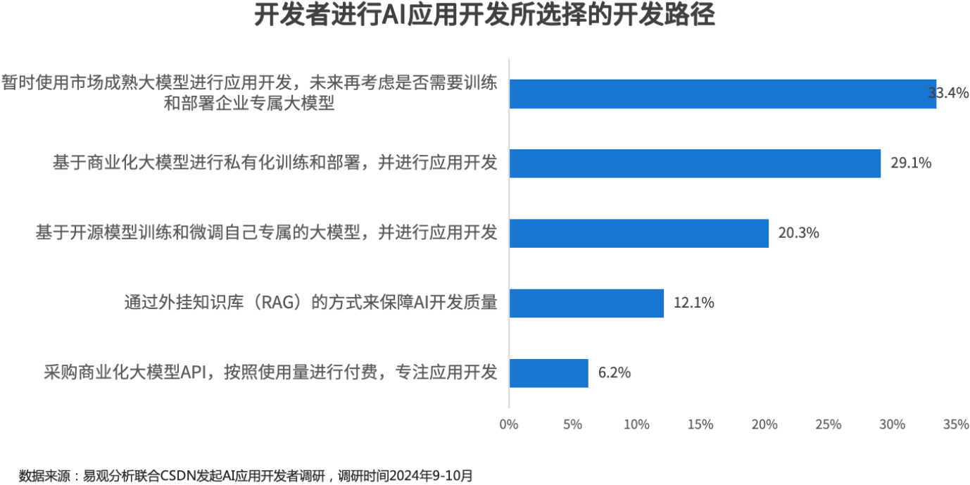 从易观和 CSDN 针对中国 AI 应用开发者的调研看,“利用市场上成熟的大模型” 是主流看法,但也不是 “那么坚固”。