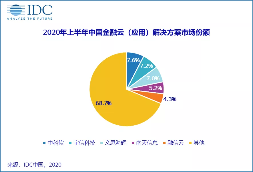 (2) 金融云解决方案市场:2020上半年,金融云解决方案市场规模达到 5.7 亿美元,其中平台与应用解决方案市场分别达到 2.2 亿美元与 3.5 亿美元。