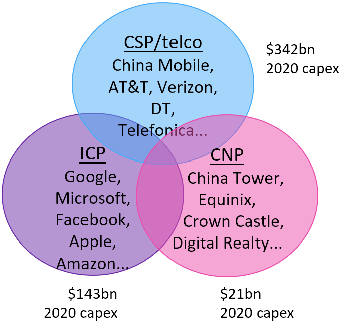 OMDIA 将 ICT 领域 CAPEX 开销比较大的玩家分为三类:(1) CSP/Telco 电信运营商;(2) ICP 大型互联网和公有云企业;(3) CNP 网络中立的基础服务公司(铁塔、数据交换中心 IX 等)。