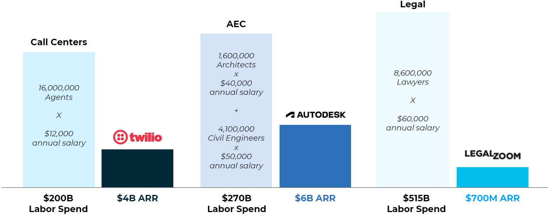 以法律行业为例,美国有 86 万律师,每年人力成本 5,150 亿美元。这个空间为 Legal Zoom 7 亿美元的 ARR 提供了足够的天花板。