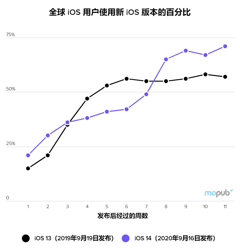 附图是 iOS 13 和 iOS 14 升级过程,前十周的渗透率。很适合作为优秀 OTA 的标杆案例。