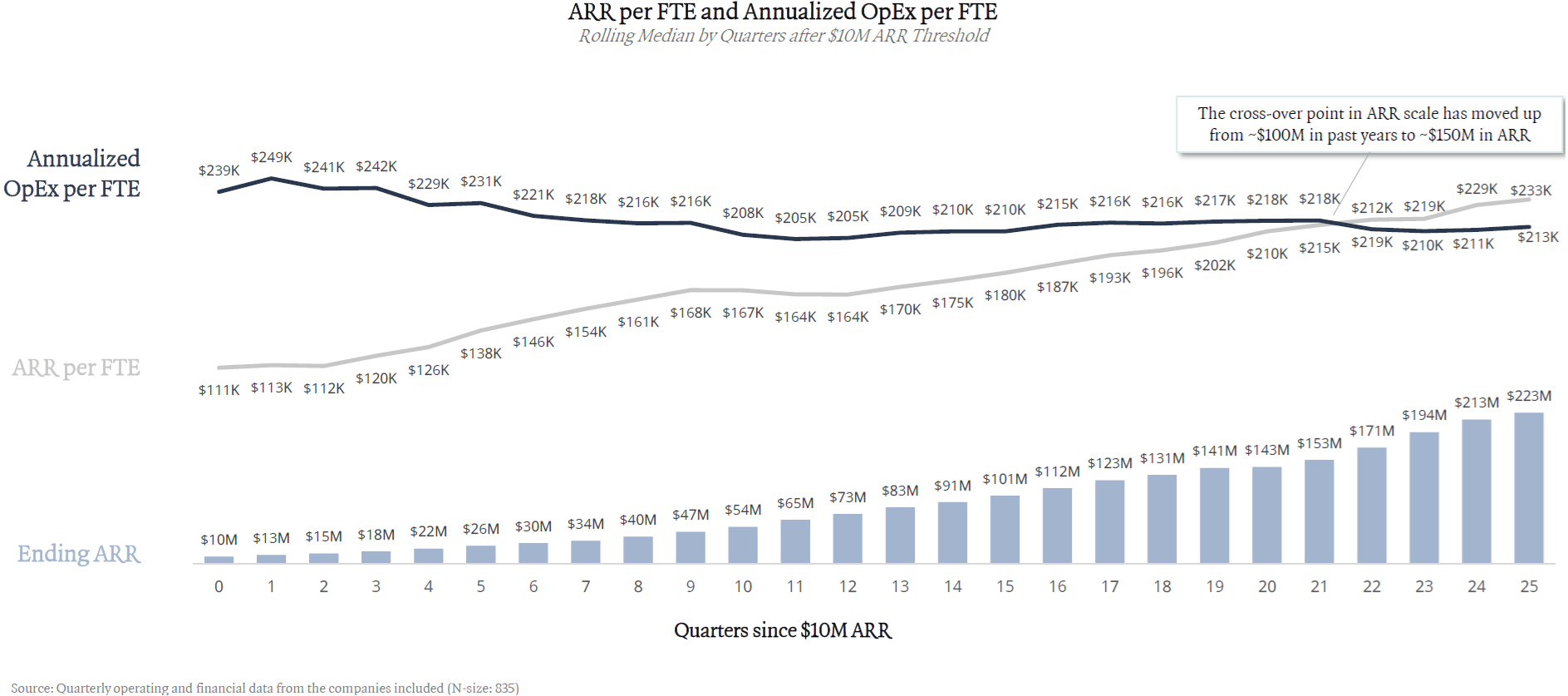 ICONIQ Capital 的研究显示,2023 年硅谷 SaaS 公司人均 ARR 超过人均 OPEX 大约在公司 1 亿美元 ARR 的时候(中位数),而 2024 年这个超越的时刻退后到了公司 ARR 在 1.5 亿美元时。