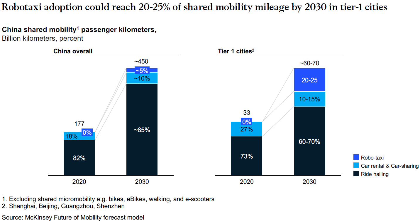 从技术创新角度,业界很关注的 Robotaxi(自动驾驶出租车)有很大的发展空间,Mckinsey 认为一线城市 2030 年 20~25% 的行驶里程回由 Robotaxi 承担。