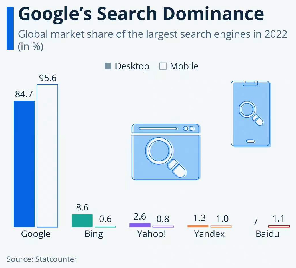 众所周知,Google 是全球搜索市场的主导者。我的关注点是,为什么 PC、平板和手机三者的份额差距还是很大的?