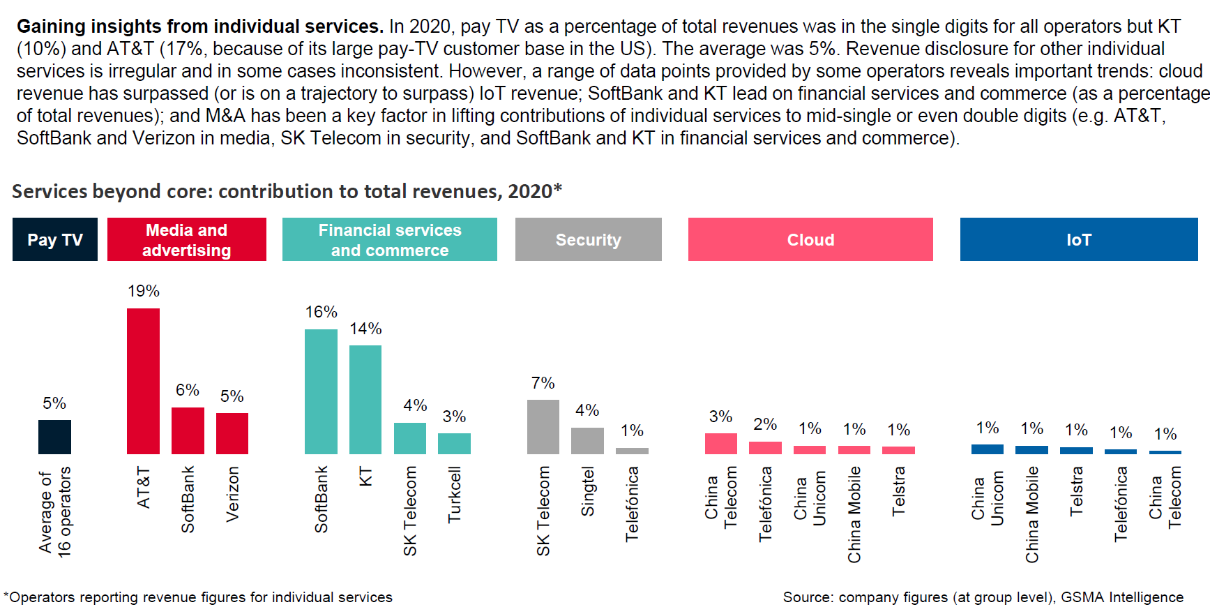 GSMA 选择了典型的六类新业务(付费电视、媒体内容和广告、金融和电子商务、安全、云计算和 IoT),看代表性运营商在这些领域在 2020 年度的收入贡献。
