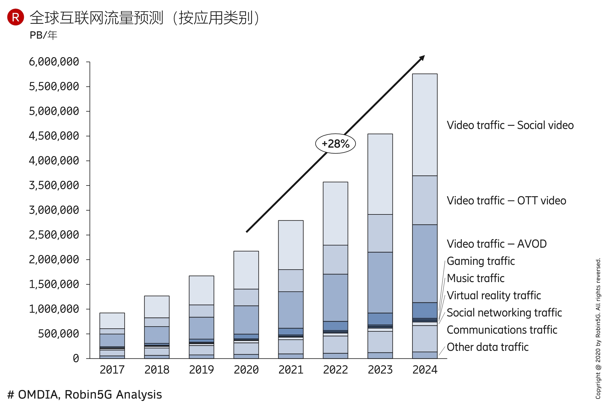 OMDIA 对全球互联网流量(固定+移动)按应用的预测,其中,几类视频占了很大比例。