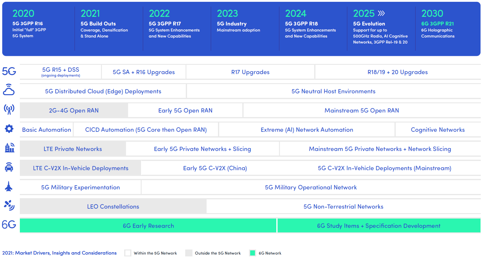 Spirent 绘制了一张很丰富的图,展示了 5G 从 2020 到 2030 这十年主要的里程碑预期。
