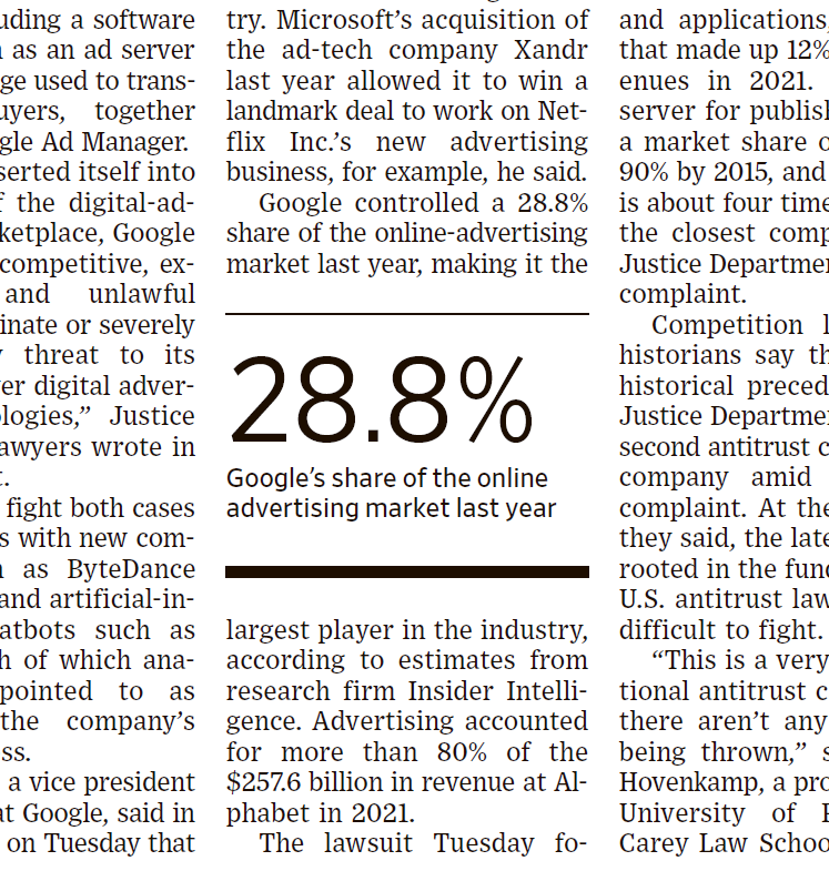 WSJ 上读到一则新闻,Google 在 2022 年拿到了全球在线广告的 28.8% 的市场份额。如果只看 “28.8%” 这个数字呢,貌似也不大。