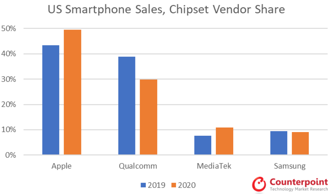 附图是 Counterpoint Research 对美国智能手机市场 2019~2020 手机芯片的份额分布。Apple 自研的手机芯片占据了最大的市场份额,差不多有 50% 了。
