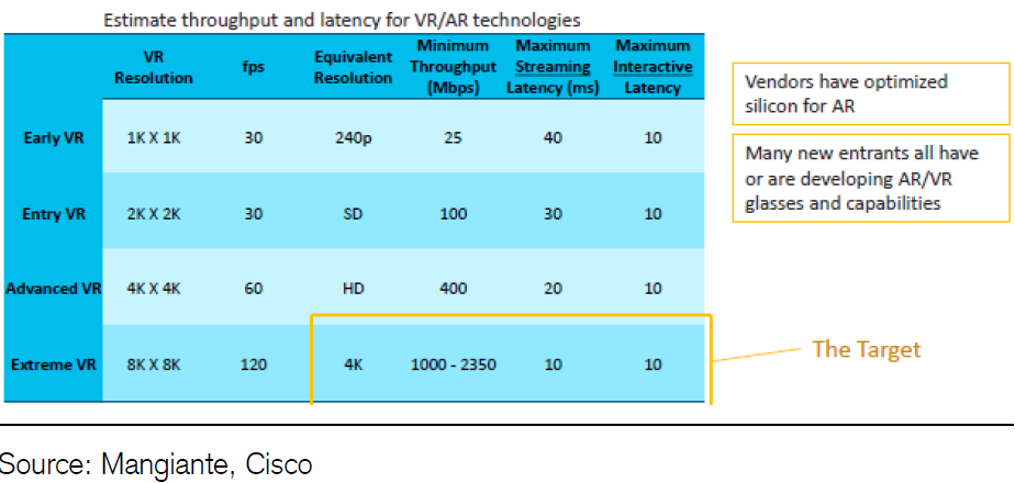 附图是 Mangiante 和 Cisco 的研究,不同版本 VR 对网络的性能要求。