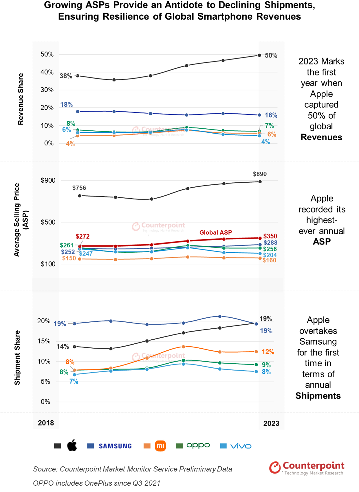 (1) 收入份额:2018 年 Apple 只有 38% 的份额,2023 年提升到了 50%。