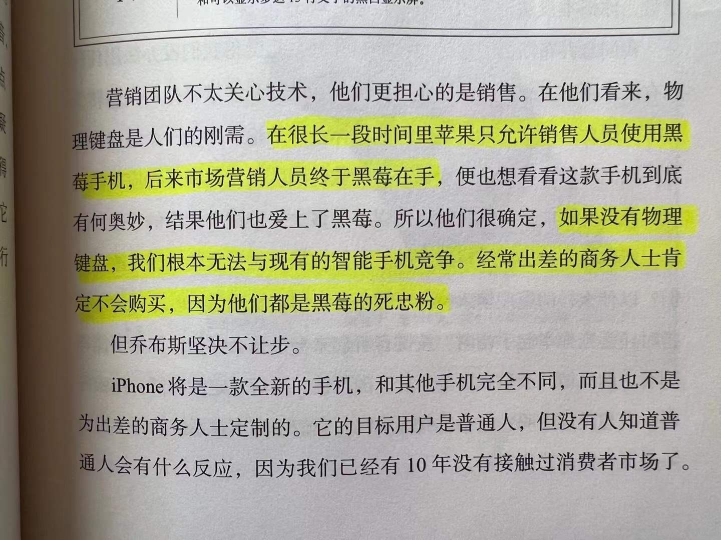 营销团队坚持要配备类似黑莓的键盘。但乔布斯坚持要大触摸屏。因为之前有键盘的手机都是给商务人士用的,商务人士只要是用来写邮件。