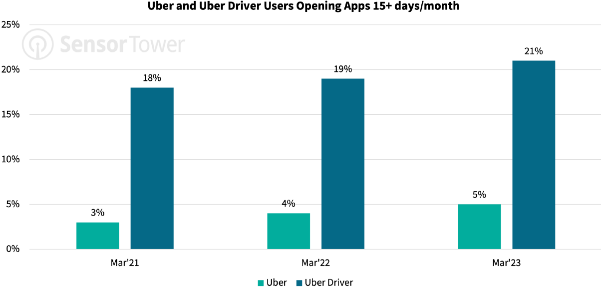 以每月打开过 APP 的天数 15+ 天为指标:2023 年 3 月,Uber(乘客)有 5% 比例,User Driver(司机)有 21% 的比例达到此指标。