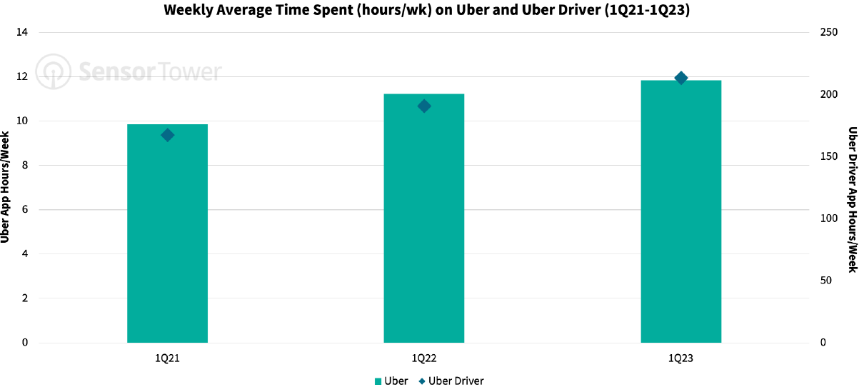 User(乘客)每周使用时长接近 12 小时, User Driver(司机)每周使用时长为 200+ 小时。