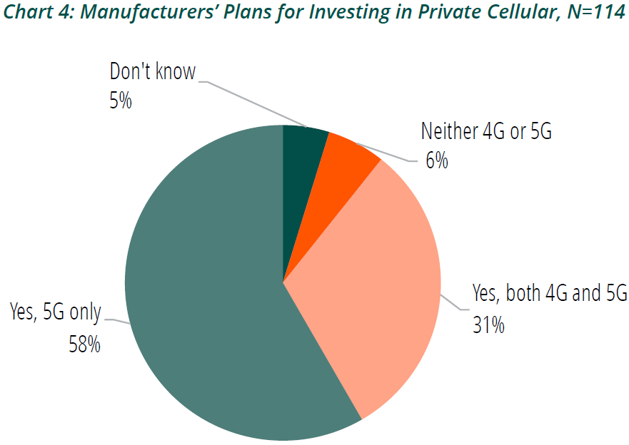 ABI Research 在 2023 年的调研显示,制造业企业如果对于蜂窝网络有兴趣或者建设实践。从技术选择上看,58% 的企业调研对象表示会选择纯 5G 的网络(5G Only)。也有 31% 的企业会同时选择 4G 和 5G。
