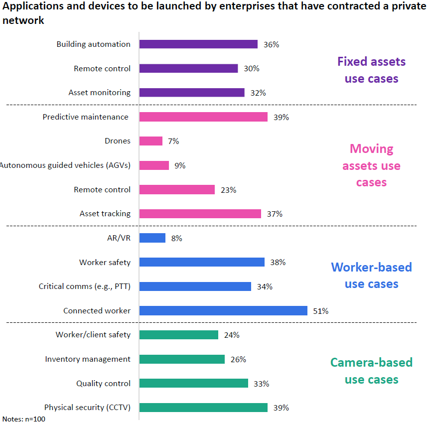 5G 专网是目前最火热的技术选择,贡献了大约 44% 的项目;北美的 CBRS 超越了 LTE 专网,成为第二大类。