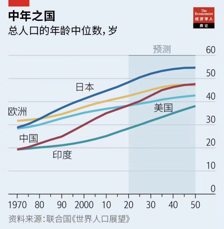 #老龄化# ⑴ 2020年中国人口年龄中位数首次超过美国;⑵ 中国老龄化速度和日本相当,略低于韩国;
