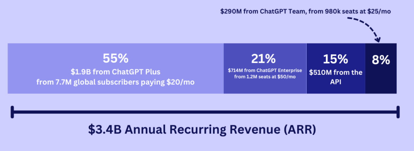 其中,ChatGPT Plus 贡献了 19 亿美元,占总收入的 55%。这部分收入来自 770 万订阅用户,每人每月支付 20 美元。