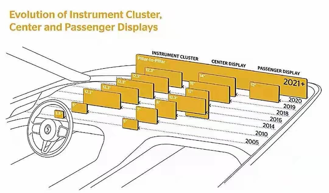 图一展示了汽车屏幕的演进时间轴,基本也映射了对 5G 网络的需求。