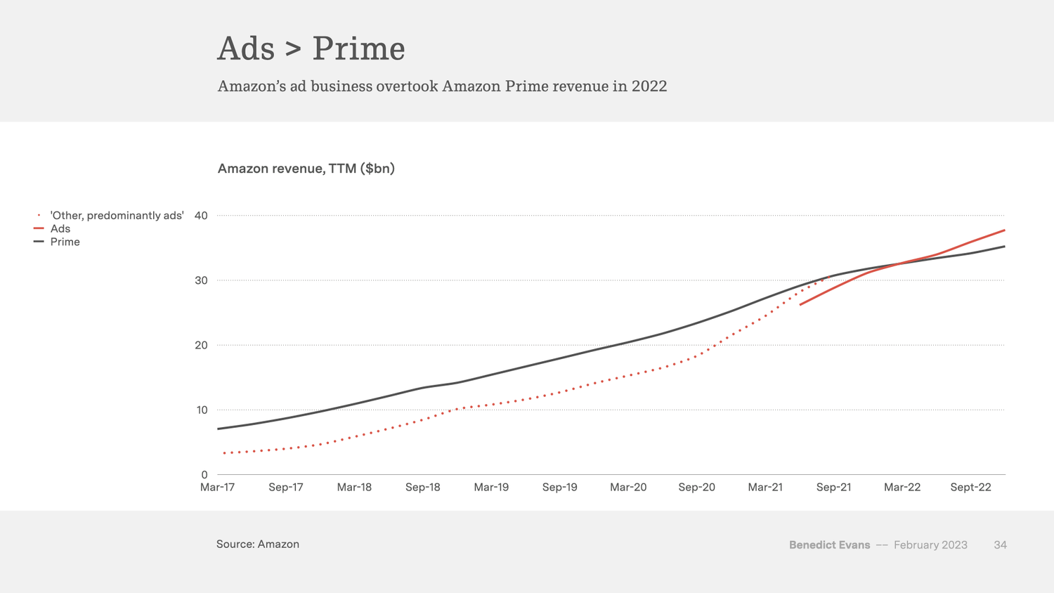 需要指出的是,Amazon 的广告年收入大约也有 100 亿美金,主要是站内搜索广告等。