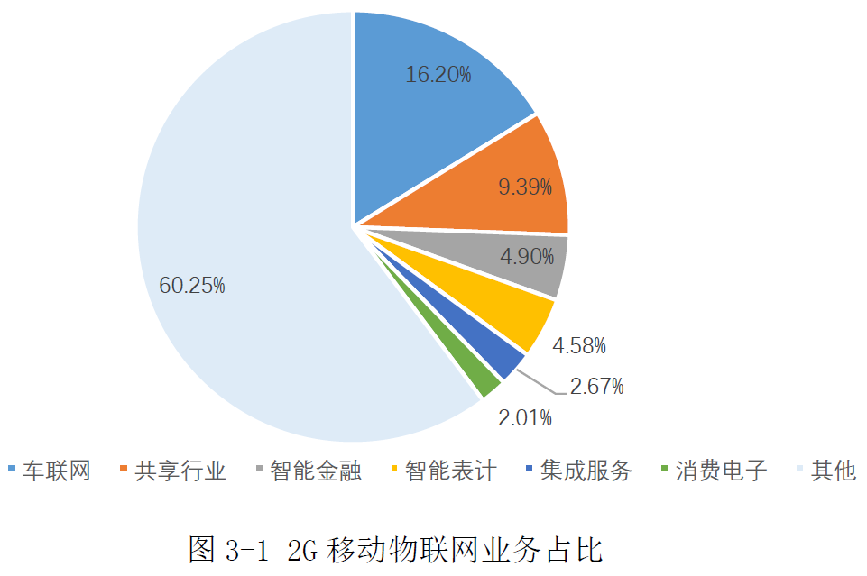附图来自中国移动研究院的研究,国内 2G 移动物联网前六类业务场景为:(1) 车联网;(2) 共享行业;(3) 智能金融;(4) 智能表计;(5) 集成服务;(6) 消费电子。