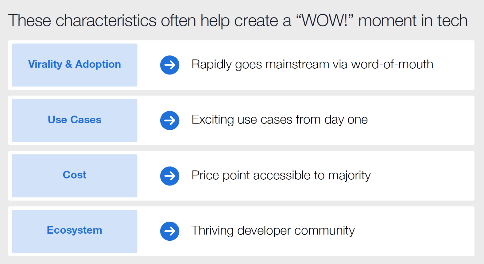 Coatue 基金认为,一项新技术产品要达到 WOW 令人兴奋的时刻,需要满足四个特征:(1) 可扩散性:借助口碑迅速走向主流人群;(2) 从第一天开始就有令人兴奋的用例 Use Case;(3) 成本可负担得起;(4) 兴旺的开发者社区。