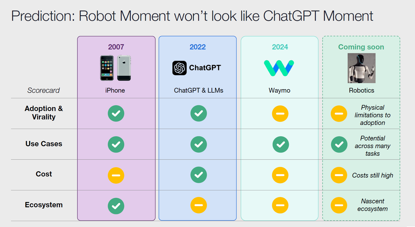 Coatue 认为 Google 自动驾驶出租车 Waymo 在 2024 年也只满足了 Use Case 这一项;而通用机器人则每一项都没有满足,即便是 Use Case 也还只是潜力展现阶段。
