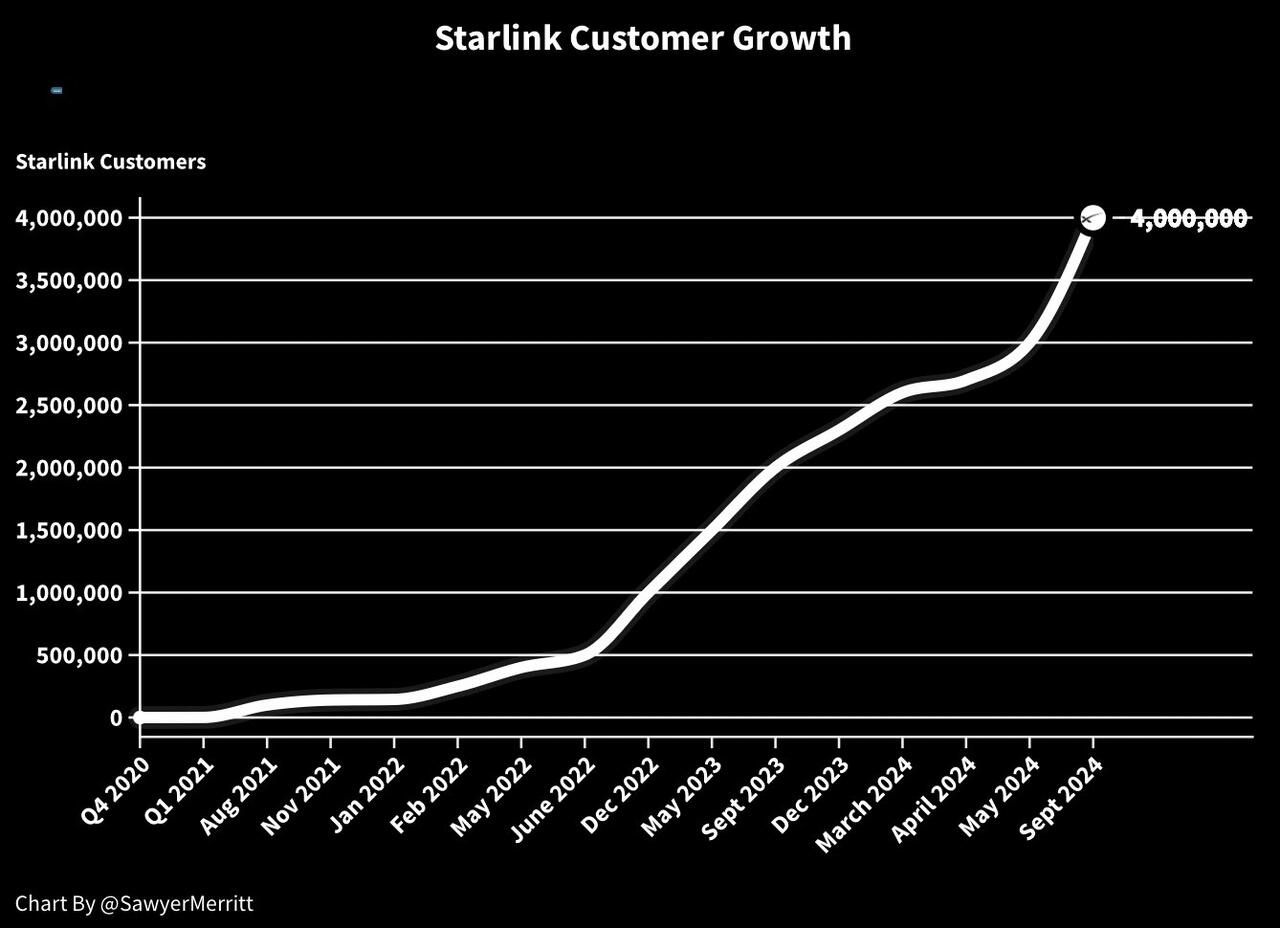SpaceX 旗下卫星互联网业务星链(Starlink)在 2024 年 9 月客户网络连接数突破 400 万户。有媒体披露,Starlink 有望达到 66 亿美元的收入,并在 2024 年实现自由现金流正增长。