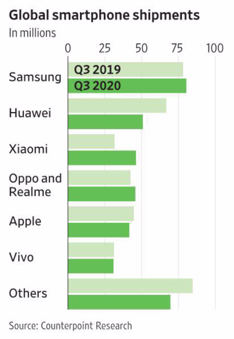 Counterpoint Research 针对全球智能机出货量 2020Q3 的排名。全球手机 Top 6 中,中国占据了四个品牌。