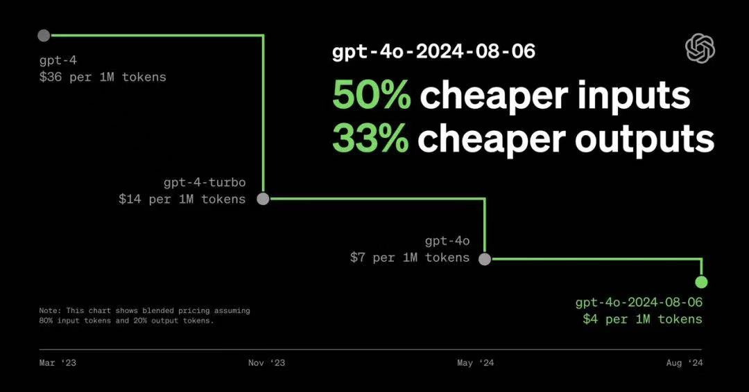 以 OpenAI GPT 模型为例,假设 80% 的 Token 用于输入,20% 的 Token 用于 输出,2023 年 3 月 1M Token 的 GPT-4 能力消费需要 36 美元,而 2023 年 11 月则为 14 美元。同样 1M Token 2024 年 5 月为 7 美元,8 月则进一步下降为 4 美元。