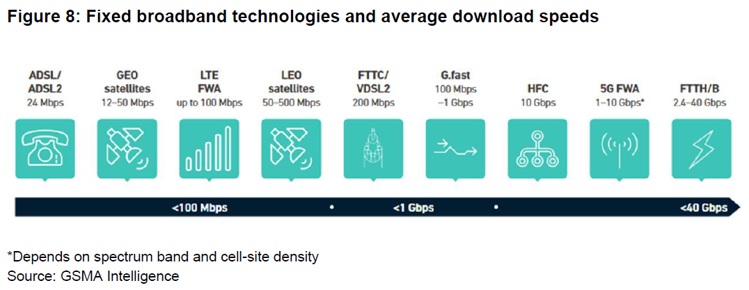 附图来自 GSMA,其对比了不同技术在接入速率的指标对比,基本可分为三档: <100Mbps,1Gbps,<40Gbps 等。