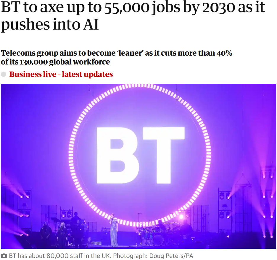 英国老牌电信运营商 BT 目前有 13 万员工,其最近宣布计划在 2030 年之前裁减 55,000 员,占总数的 40%。