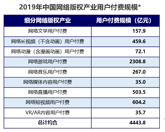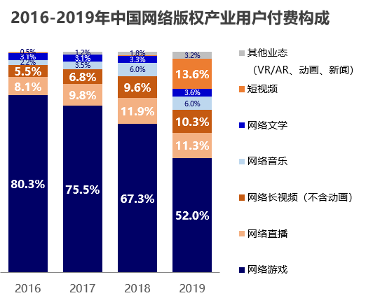 根据国家版权局的数据,中国网络版权内容(游戏、视频、文学、新闻等) 2019 年达到 9584.2 亿元,其中52.7% 来自后向广告,46.4% 来自前向用户付费,0.9% 来自版权运营。