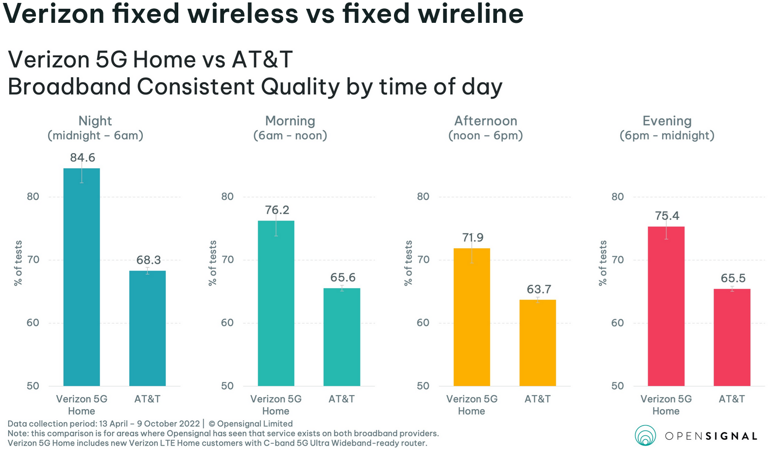 第三方网络测评机构 Open Signal 的数据显示,Verizon 5G Home(基于 5G FWA 固定无线接入)的宽带一致性质量超过了 AT&T 的固定宽带。