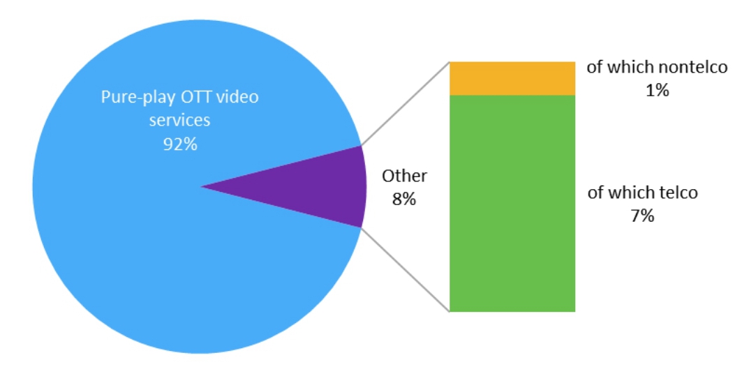根据 OMDIA 针对国际市场的研究,92% 的订阅用户还是来自诸如 Netflix 等互联网 OTT 视频网站;来自运营商自有品牌的份额为 7%。