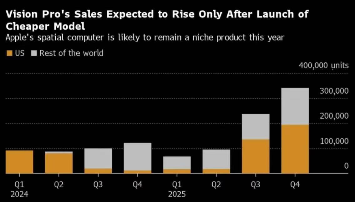 值得关注的是,美国后续的销售量在降低,这并不是一个乐观的信息。IDC 预测 2025 年 Apple 会推出平价版的 Vision Pro,有望提升销量。