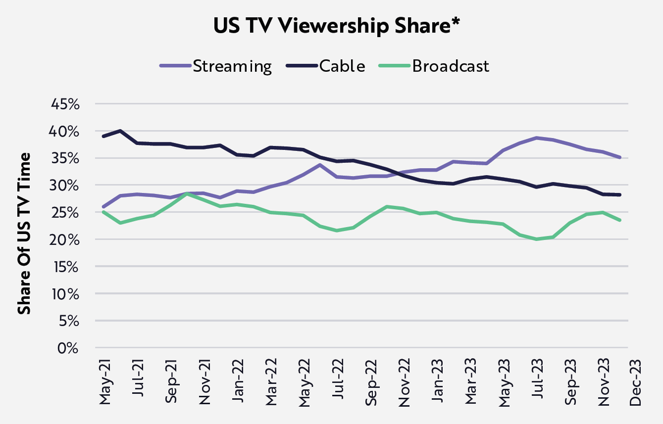 2021-2023 美国大屏的收视率份额,流媒体视频的份额从 25% 提升到 35%,有线电视从 40% 下降到低于 30%。