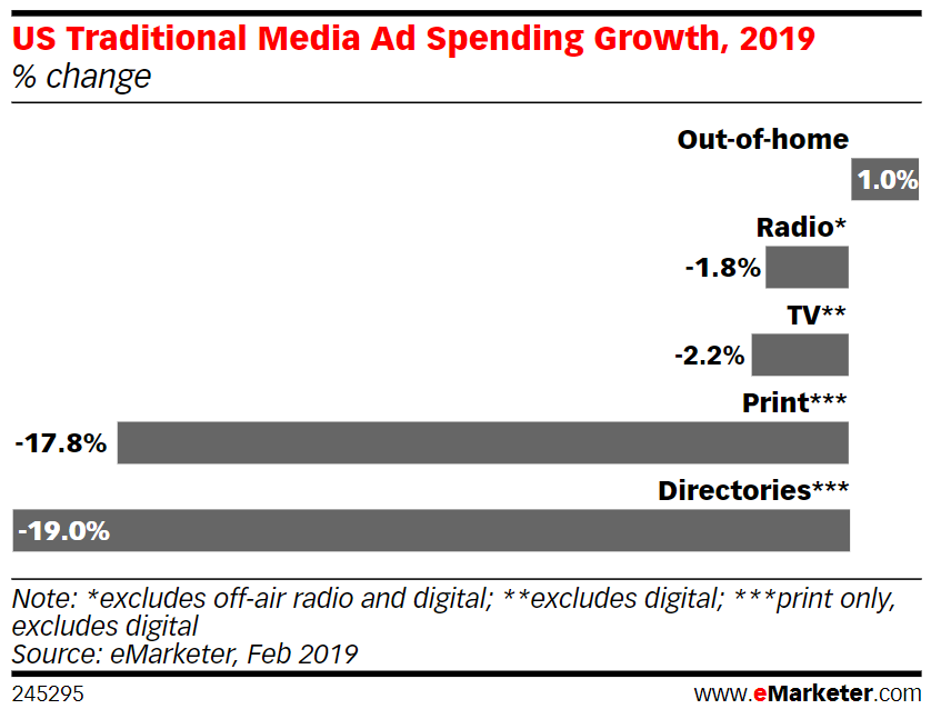 附图是美国企业对传统媒介的广告开支的增减变化,能看到一些规律: