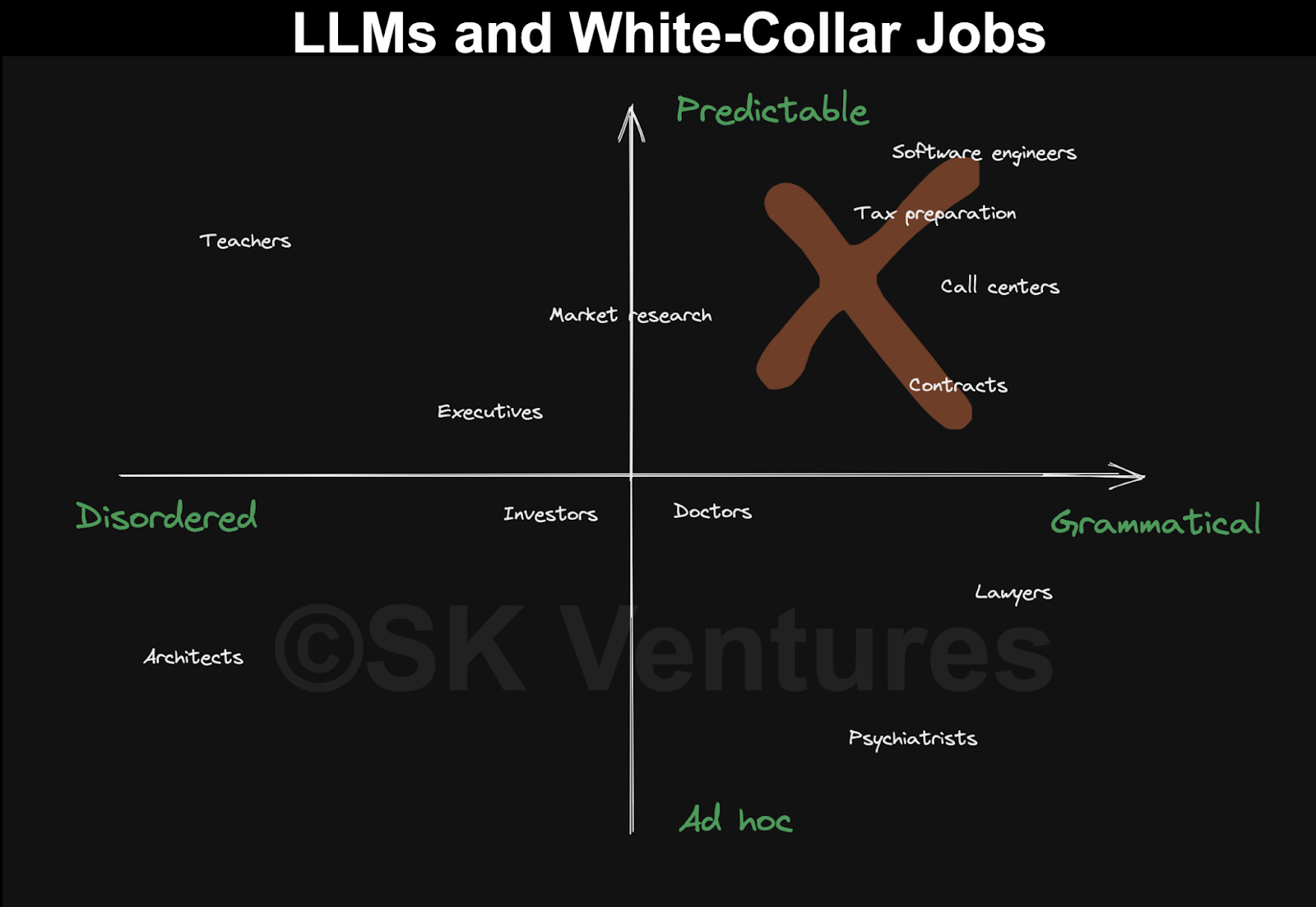 风险投资公司 SK Ventures 绘制了一张图,试着归纳 ChatGPT 背后的大语言模型(Large Language Model,LLM)后续对白领职业的影响。
