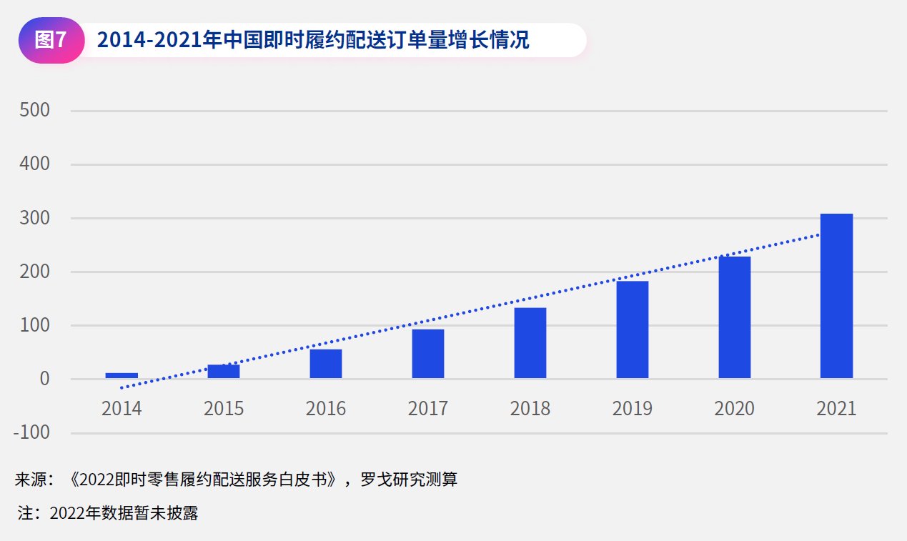 商务部国际贸易经济合作研究院的数据显示,2022 年中国即时零售的市场规模突破了 5,000 亿元,预计到 2025 年的规模会达到 2022 规模的三倍。