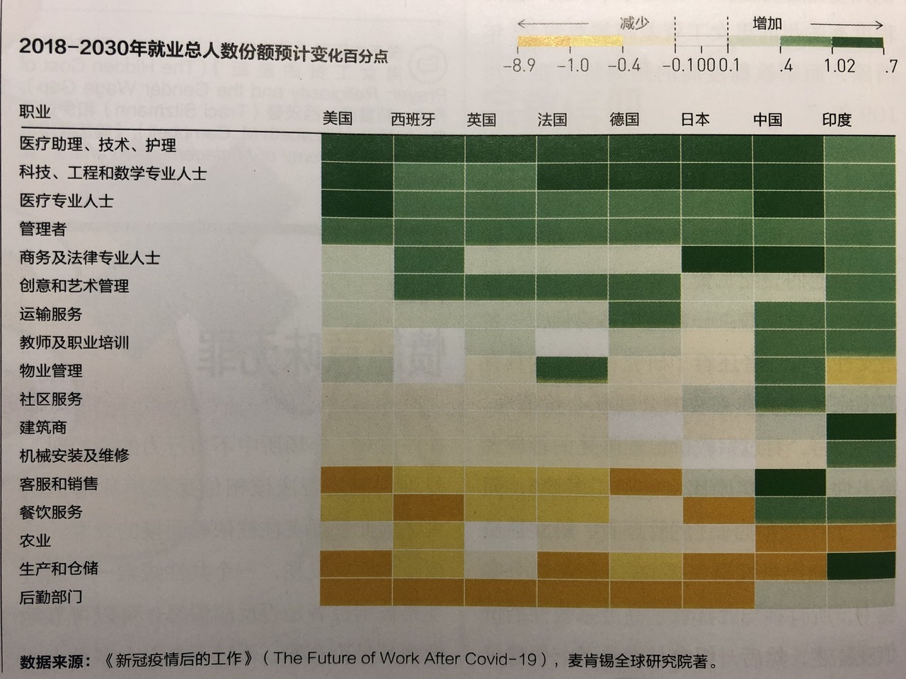 WSJ 基于美国劳工局的统计数字绘制了一张图,展示了不同行业今年二月到九月的岗位数字变化。