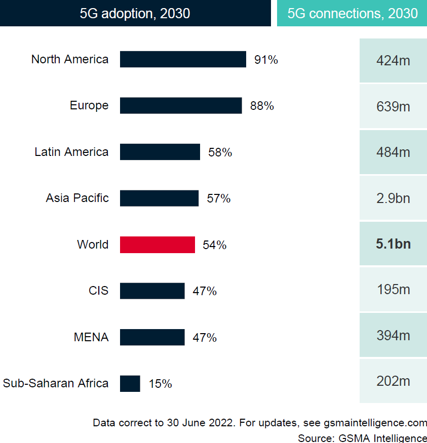 GSMA 预计到 2025 年,4G 和 5G 的比例会接近持平,2026 年 5G 比例会超过 4G。