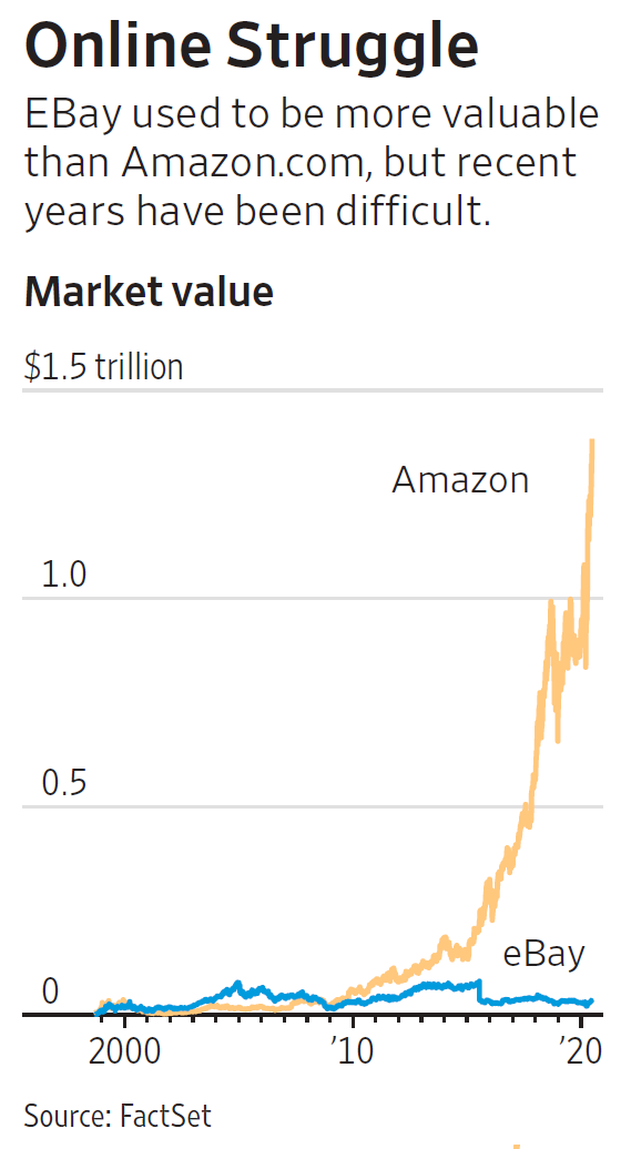 曾经相当长的一段时间,eBay 的市值是高过 Amazon 的,现在差距就非常巨大的了。