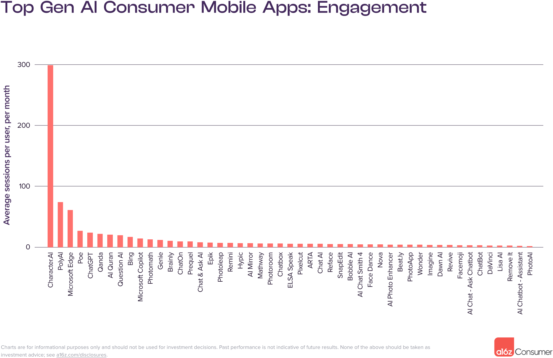 Similarweb 的数据监测显示,用户每天在 Character.AI 上花费的平均时间达到了两小时。根据 SensorTower 的数据,Character.AI 平均每个用户每月吸引 298 次会话,排名第二的 Poly.AI 平均每个用户每月产生 74 次会话。