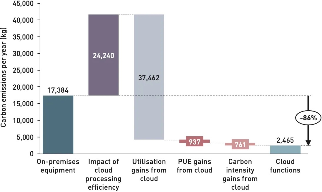 Analysys Mason 咨询公司的研究显示,针对 “网络防火墙、WAF、DDoS 防攻击、负载均衡、WAN 优化、SD-WAN” 等网络软硬件设备,如果迁移到云端,有望将碳排放量减少 78-96%。