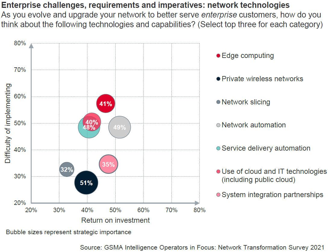 (1) 实施难度角度:企业专网、网络切片和集成合作伙伴是相对简单的;边缘计算和云计算则较难,反映了运营商现有能力的长短板;