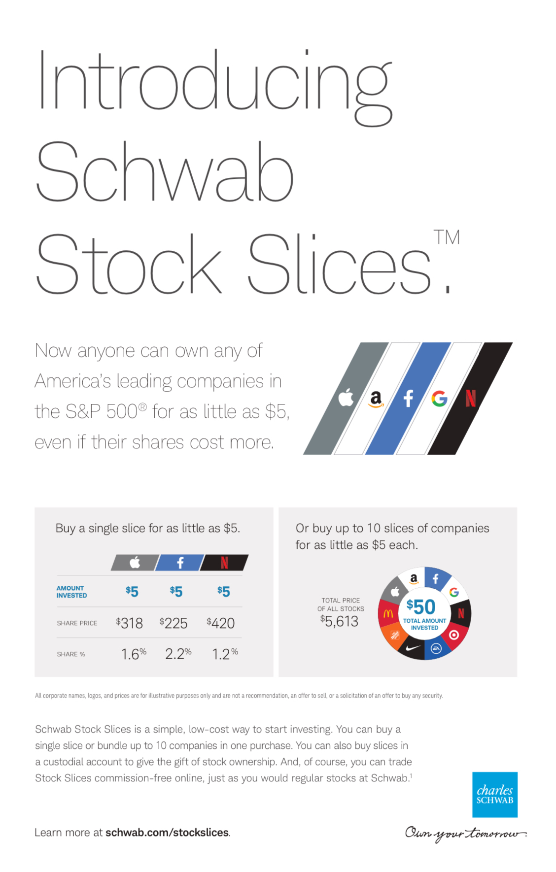 该公司称,这项服务让其用户在任一时间点购买至多10份零股。与常规股票交易一样,Schwab Stock Slices 提供线上免佣金交易。