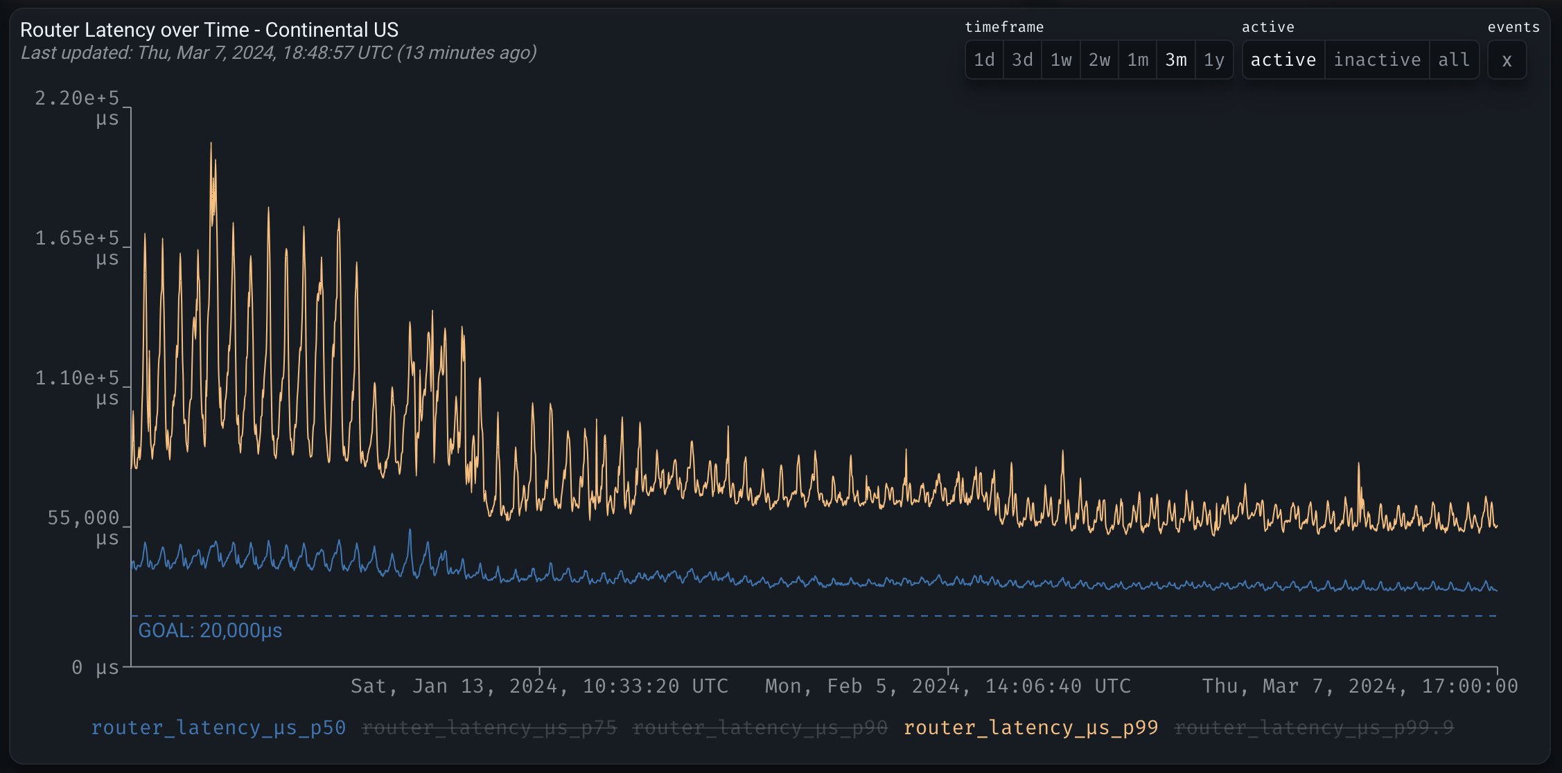 即便如此,仍然面临不同位置性能不稳定的问题。Starlink 最新披露的数据显示,其在近期显著降低了全球用户的中位延迟(p50)和最差延迟(p99)。以美国地区为例,高峰期中位数延迟从 48.5ms 降低到 33ms;最差延迟也从 150ms 降低到 65ms。